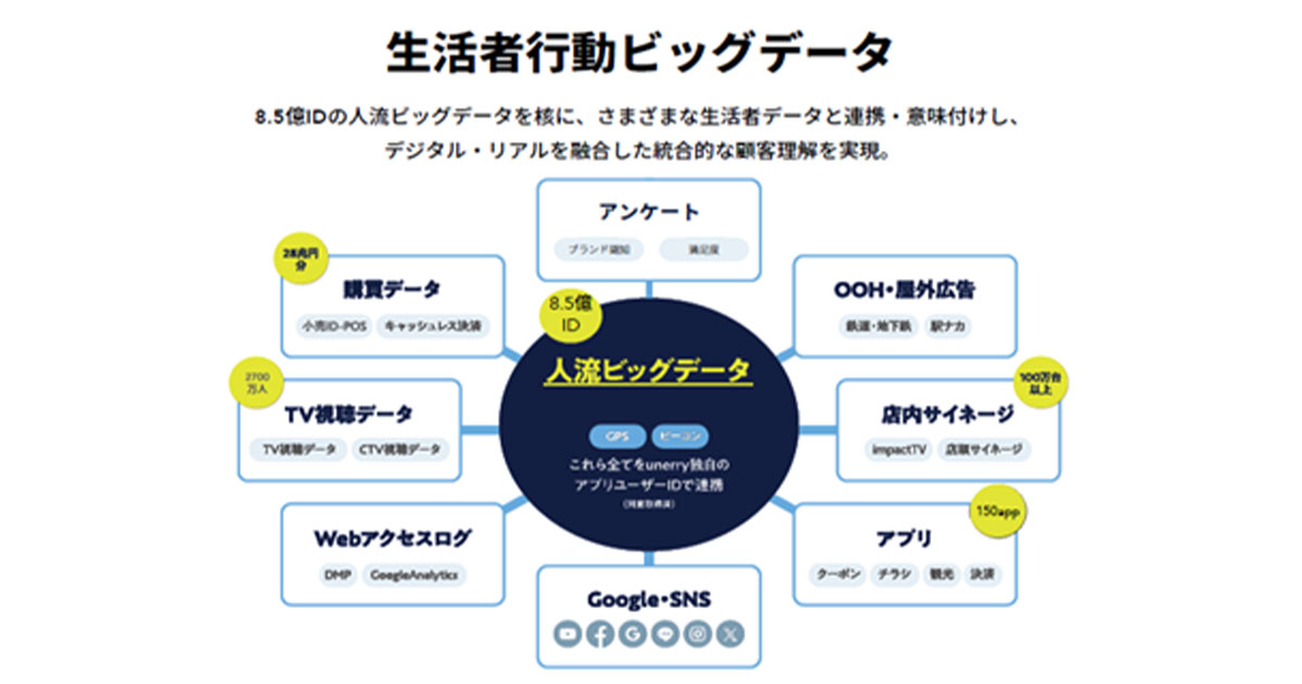 リアル行動データプラットフォーム「Beacon Bank」を運営する2015年創業のデータカンパニーです。GPSおよびビーコン技術を活用し、約150のスマートフォンアプリから取得する約8.5億ID(うち国内約2.4億ID)の屋内外の人流ビッグデータをAIで解析。「心地よい未来を、データとつくる。」というミッションを掲げ、OMOマーケティング支援や、スマートシティの実現に向けた事業等を展開しています。